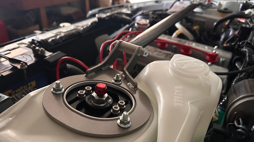 This was not without trauma and anxiety though – I still ended up using Delrin washers beneath the strut bar to avoid any potential problems. The other thing is that with all strut bars for the AE86, they touch and compress the strut tops rather ungracefully.